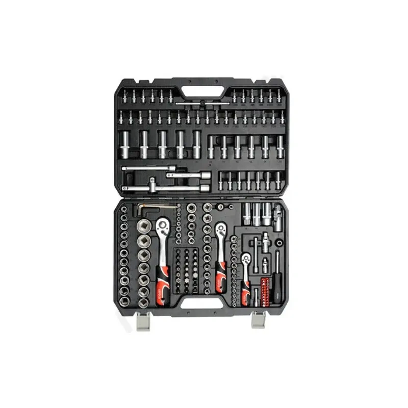 Professionaalne tööriistakomplekt, mis on välja töötatud spetsialiseeritud autode ja mehaaniliste teenuste vajaduste rahuldamiseks. Pesavõtmed ja pistikupesad on valmistatud tugevast tööriistasulamist kroom-vanaadium CrV 50BV3. Mütsid valmistatud sepistamise teel ja enne kõvenemise protsessi kalibreeriti neid täppismõõturite ja kontrollseadmete abil. AS-Drive süsteemiga varustatud pistikupesad, maksimaalse pöördemomendi suurendamine 25% võrra, täismõõduliste kaitseribade äärtega, kahetoonilise pinnaviimistlusega korgid. Komplekt sisaldab ka kõva S2 terast. Seade võimaldab teha väga suure koormuse ja täpsusega tööd, mis võimaldab teostada mitmesuguste nimimahtude keermestatud ühenduste lahti keeramist ja kruvimist võimaldavaid töid.