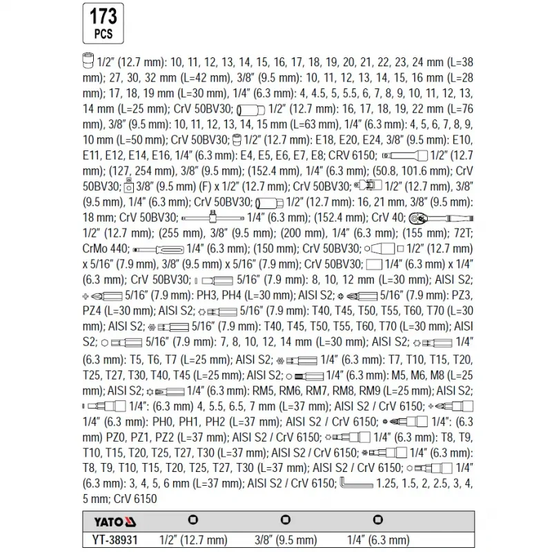 Tööriistakohver 173osa 1/4" 3/8" 1/2" padrunid, otsikud ja tarvikud YT-38931