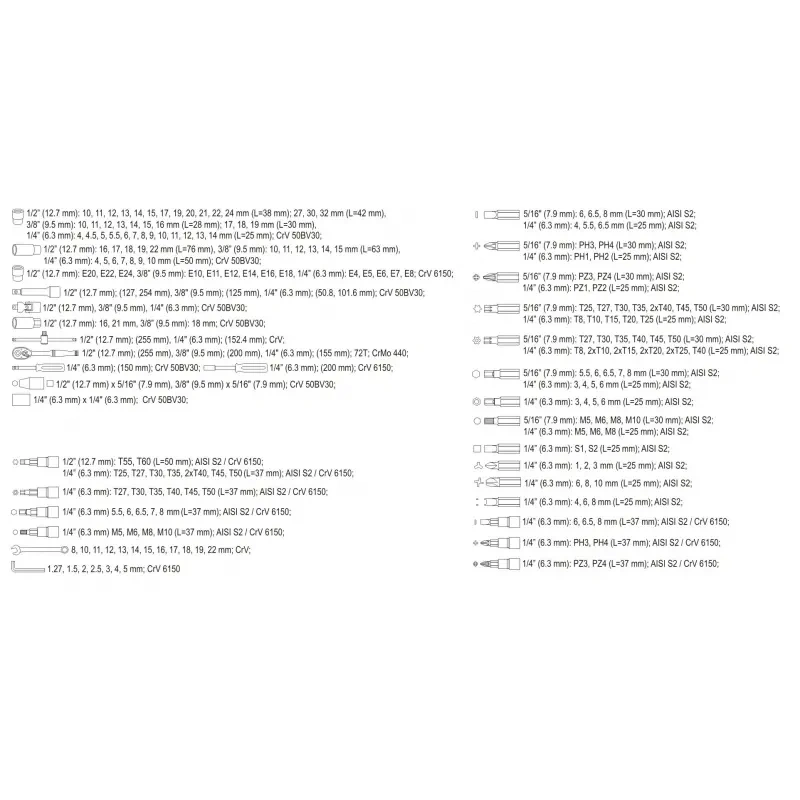 | Suurus [toll] | 1/2, 1/4, 3/8 |