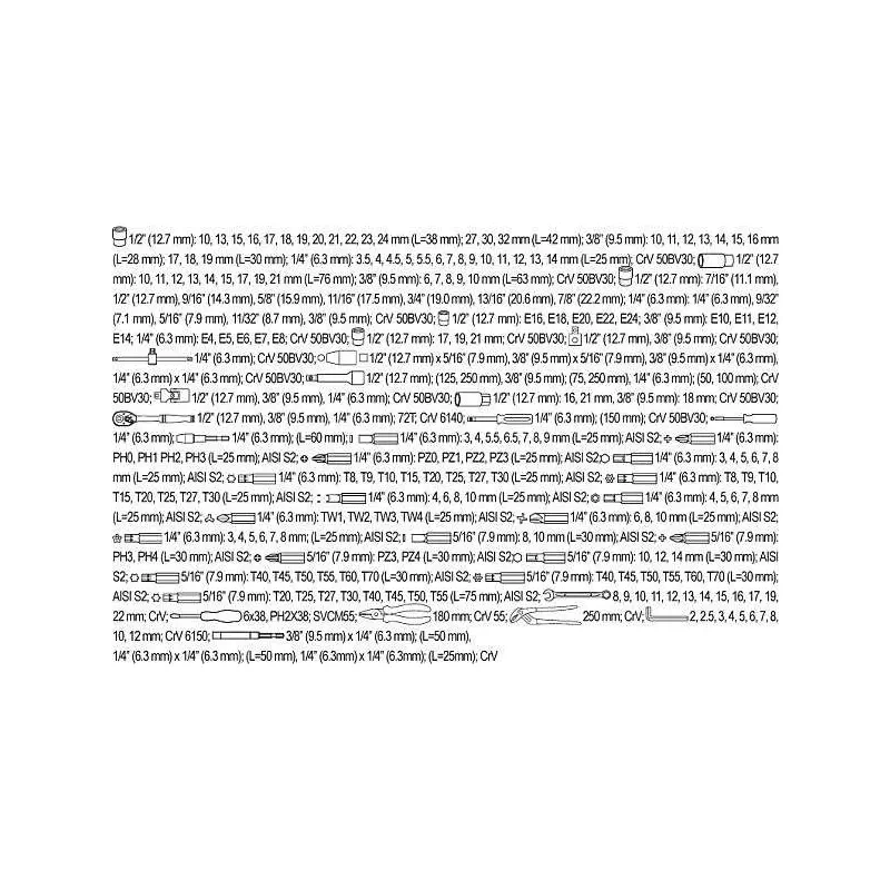 - Padrunid 1/2 "Torx: E16, E18, E20, E22, E24; 3/8 "E10, E11, E12, E14; 1/4 "E4, E5, E6, E7, E8.