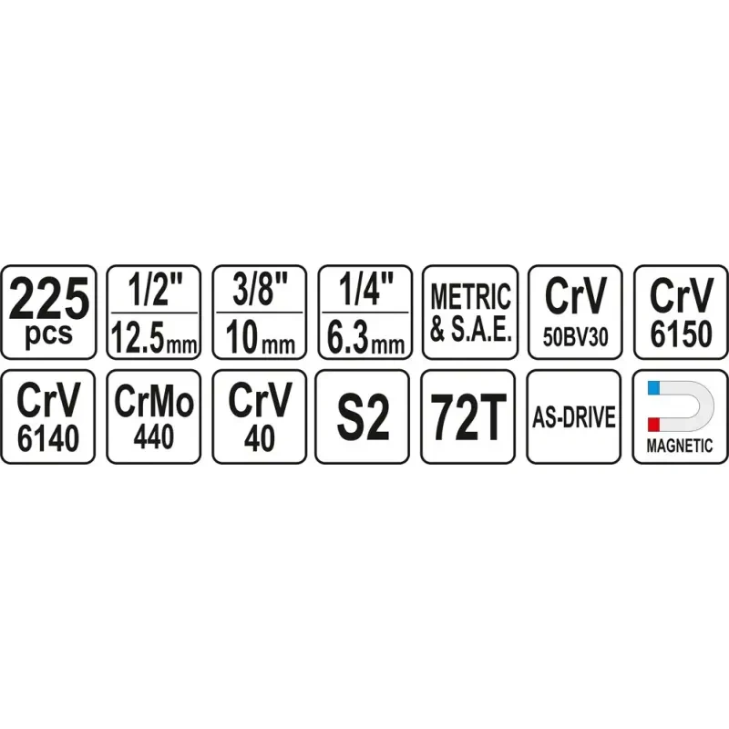 Tööriistakohver 225osa 1/4" 3/8" 1/2" YT-38941