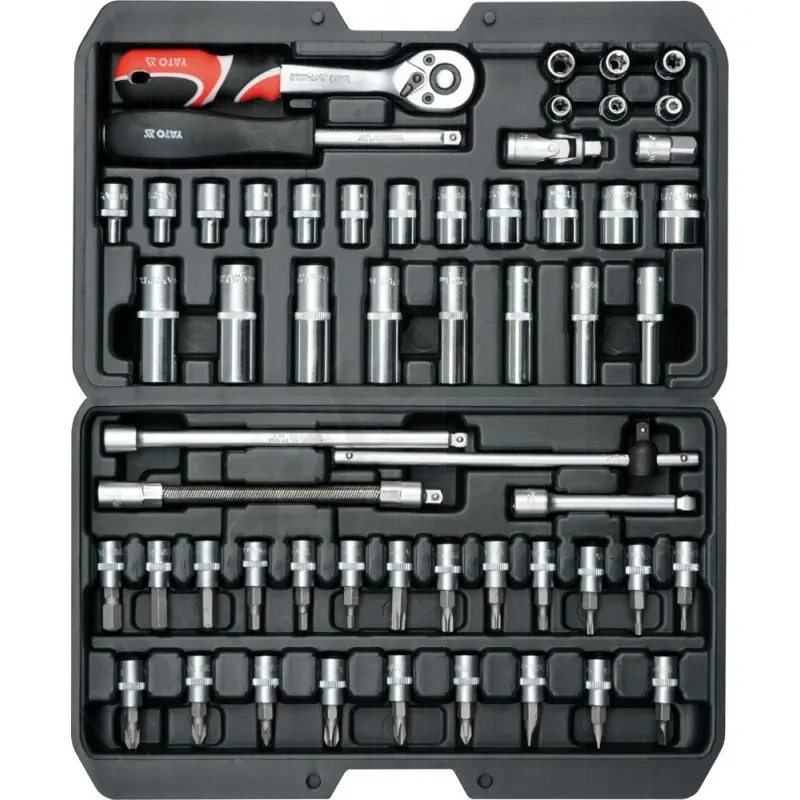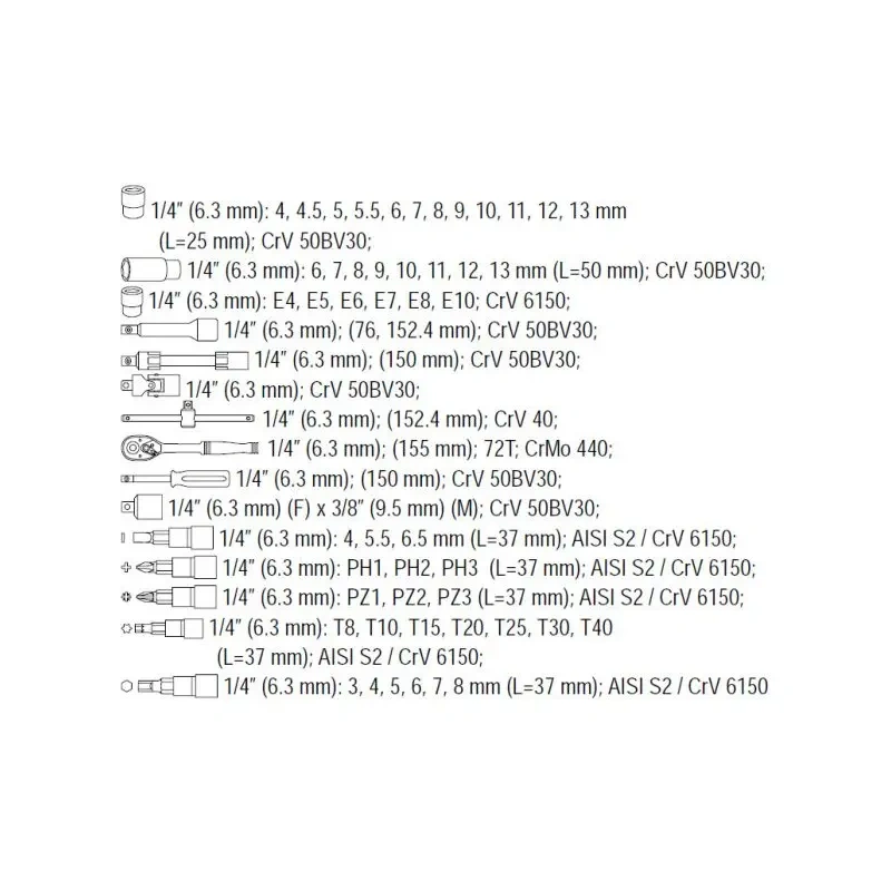 Professionaalne tööriistakomplekt, mis on välja töötatud spetsialiseeritud autode ja mehaaniliste teenuste vajaduste rahuldamiseks. Pesavõtmed ja pistikupesad on valmistatud tugevast tööriistasulamist kroom-vanaadium CrV 50BV3. Mütsid valmistati suruga sepistamise teel ja enne kõvenemise protsessi kalibreeriti neid täppismõõturite ja kontrollseadmete abil. Seade võimaldab teha väga suure koormuse ja täpsusega tööd, mis võimaldab teostada mitmesuguste nimimahtude keermestatud ühenduste lahti keeramist ja kruvimist võimaldavaid teenuseid. Ratchet 72 hambaid (töötab insult 5 kraadi).