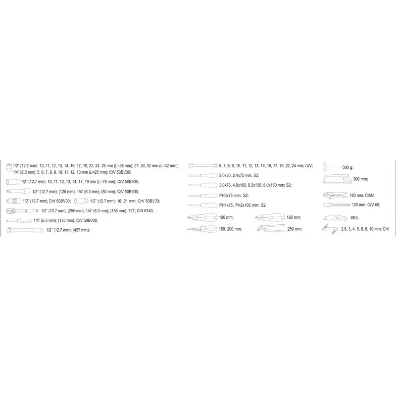 Professionaalne 79-elemendiline tööriistakomplekt, mis töötati välja spetsiaalsete autode ja mehaaniliste teenuste vajaduste rahuldamiseks. Pesavõtmed ja pistikupesad on valmistatud vastupidavast CrV kroom-vanadioni terasest tööriistast.