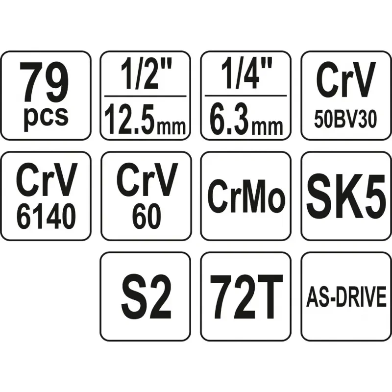 Tööriistakohver 79osa 1/4" 1/2" +saag+haam+näpits+võti YT-38911