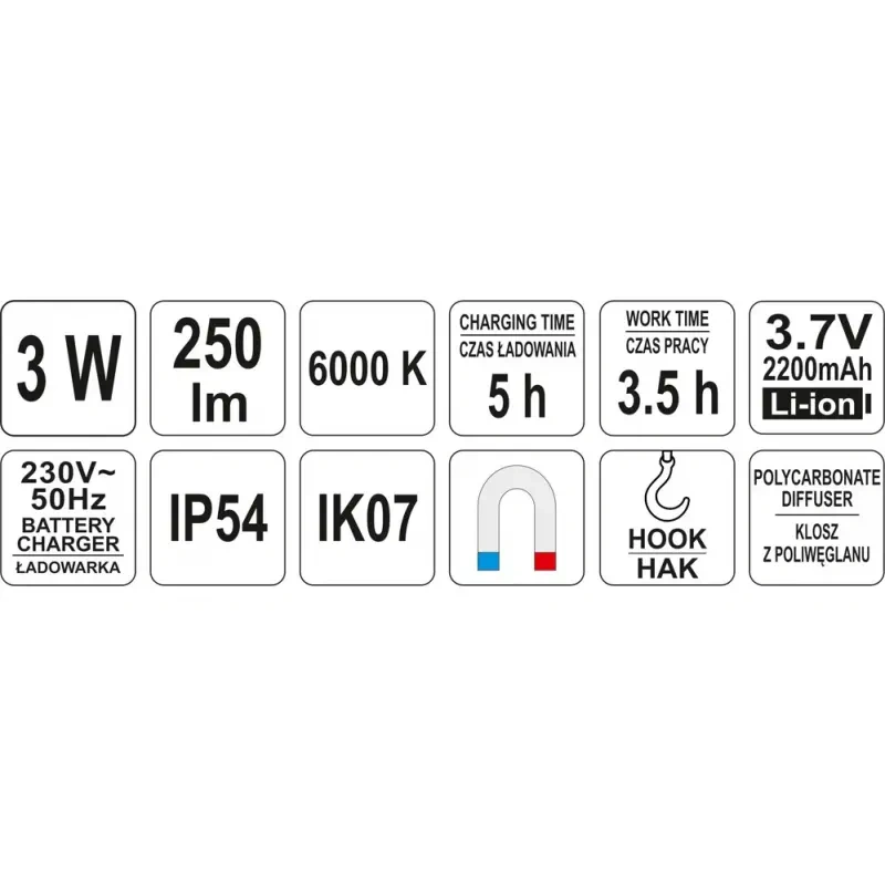 - Lamp töötab võimsusega 2200mAh liitium-ioon akul , mis tagab 3,5-tunnise katkematu töö. Täielik laadimine nõuab 5 tundi.