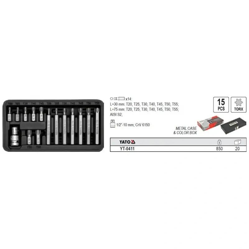 Torx otsikute komplekt 15osa T20-T55 YT-0411