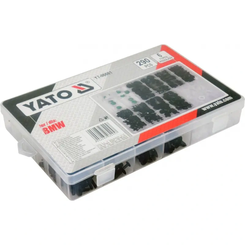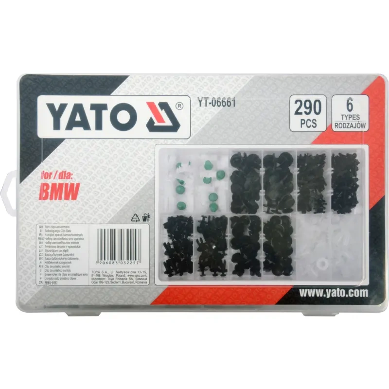 TRIM CLIPS ASSORTMENT FOR BMW 290 PCS, CONTAINS: 10 PCS FIXED CLIPS (151.1457), 35 PCS LOCATOR (151.1597), 70 PCS WINDSHIELD HOLDER (151.1596), 40 PCS LOCATOR (151.1612), 35 PCS DOOR CLIPS (151.1968), 100 PCS NUTS (151.1011)