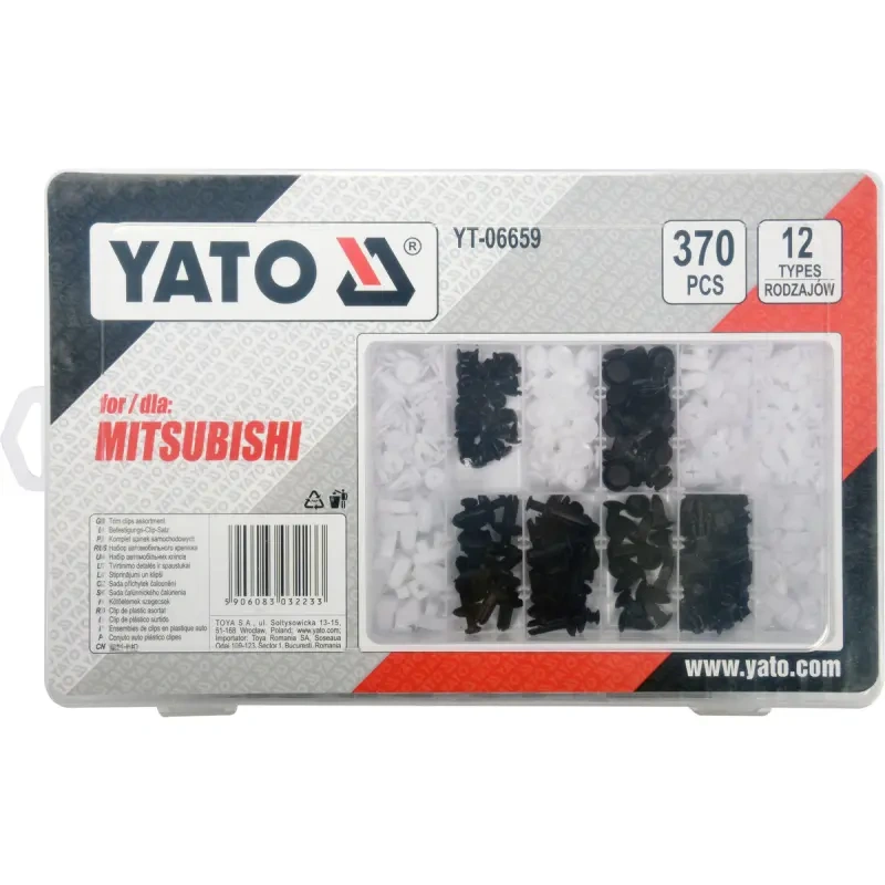 TRIM CLIPS ASSORTMENT FOR MITSUBISHI 370 PCS, CONTAINS: 40 PCS FIXED CLIPS (151.1803), 40 PCS HOOD INSULATION LAYER LOCATOR (151.0220), 40 PCS CLIPS (151.1220), 20 PCS WHEEL FENDER AND BUMPER LOCATOR (151.1114), 30 PCS CLIPS (151.0384), 50 PCS LIGHT FIXED NUTS (151.0414), 30 PCS CLIPS (151.0357), 10 PCS LOCATOR (151.0182), 15 PCS WHEEL FENDER CLIPS (151.2776), 15 PCS LOCATOR (151.0129), 50 PCS CAR BODY CLIPS (151.1215), 30 PCS CLIPS (151.2844)