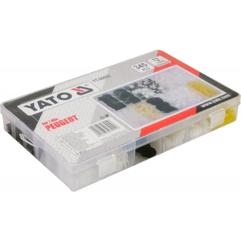 TRIM CLIPS ASSORTMENT FOR PEUGEOT 345 PCS, CONTAINS: 50 PCS LOCATOR (151.3110), 20 PCS DOOR LOCATOR (151.1221), 20 PCS CLIPS (151.3021), 20 PCS LOCATOR (151.9009), 25 PCS DOOR CLIPS (151.9010), 35 PCS LOCATOR (151.1557), 30 PCS NUTS (151.1011), 35 PCS CLIPS (151.1811), 15 PCS CAR-ROOF CLIPS (151.9011), 25 PCS DOOR CLIPS (151.1712), 30 PCS DOOR LOCATOR (151.1634), 40 PCS LOCATOR (151.9013)
