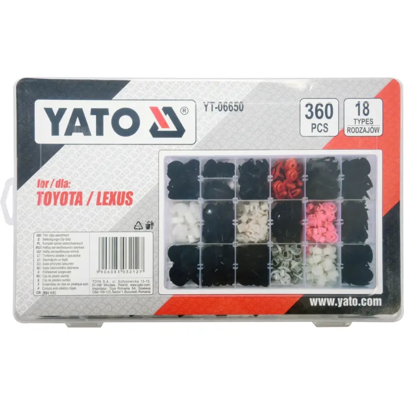 TRIM CLIPS ASSORTMENT FOR TOYOTA/ LEXUS 360 PCS, CONTAINS: 10 PCS THERMAL BAFFLE CLIPS (151.1252), 25 PCS CLIPS (151.0418), 20 PCS LOCATOR CLIPS (151.1705), 35 PCS LOCATOR CLIPS (151.1325), 30 PCS CLIPS (151.1212), 15 PCS CAR BUMPER CLIPS (151.1206), 15 PCS CAR BUMPER LOCATOR (151.1266), 40 PCS LIGHT FIXED NUTS (151.0381), 10 PCS CAR BODY LOCATOR (151.9004), 20 PCS DOOR CLIPS (151.9005), 10 PCS U-NUTS (151.1297), 20 PCS DOOR LOCATOR (151.0037), 25 PCS CLIPS (151.1151), 25 PCS CLIPS (151.1150), 15 PCS CAR BUMPER LOCATOR (151.1184), 20 PCS HOOD INSULATION LAYER LOCATOR (151.1256), 10 PCS FRONT CAR BUMPER LOCATOR (151.9006), 15 PCS HOOD INSULATION LAYER LOCATOR (151.1300)