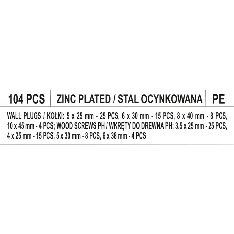 PE-tihvtid: 5 x 25 mm (25 tk), 6 x 30 mm (15 tk), 8 x 40 mm (8 tk.), 10 x 45 mm (4 tk.)