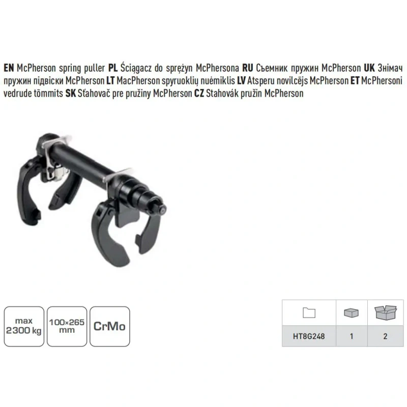 Tõmmits MacPhersoni vedrude lahtivõtmiseks ja kokkupanekuks enamikus sõiduautode ja kaubikute mudelites. See on mõeldud professionaalsetele autotöökodadele ja teenindustele, samuti autokere töökodadele.