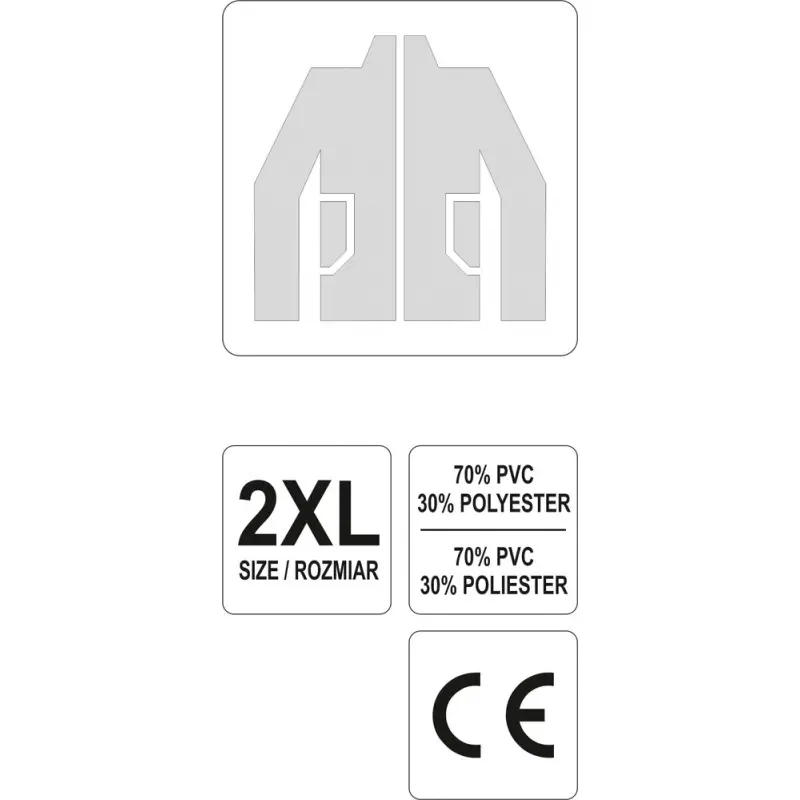Kollane vihmamantel, 70% PVC, 30% polüester . Tugevdatud täiendavate kinnitusdetailidega. Hood on tõmmatud stringid, kaks välimist taskut , tõmba varrastega, mis kaitsevad tuule eest. Ventilatsioonisüsteem tagaküljel. XXL suurus.