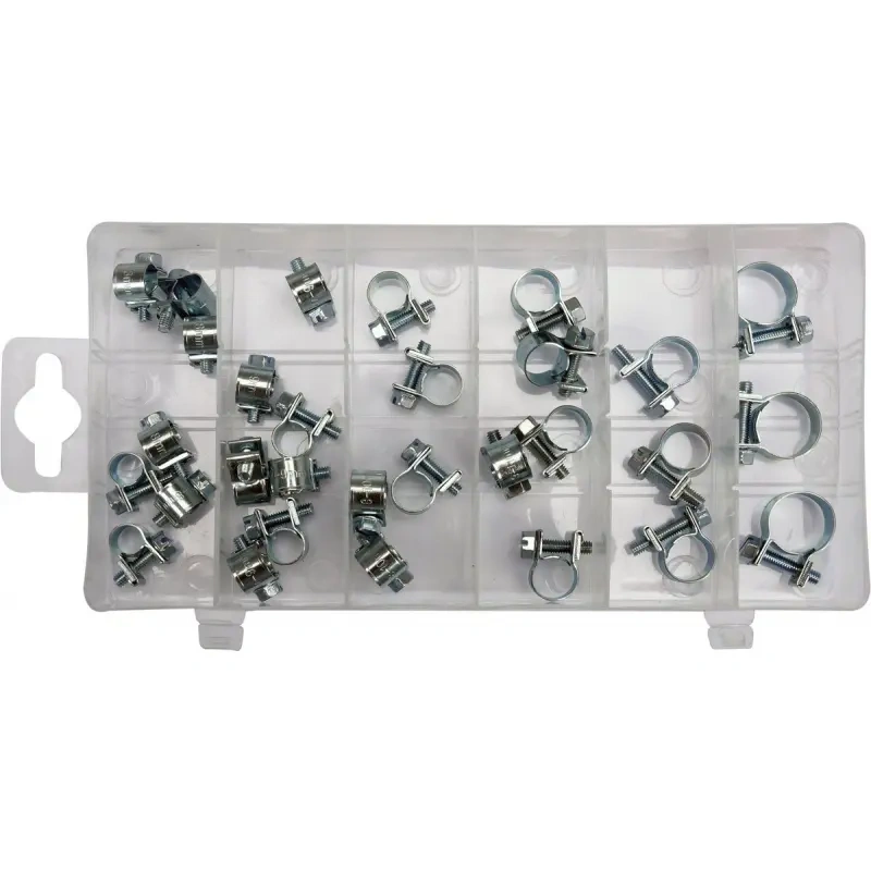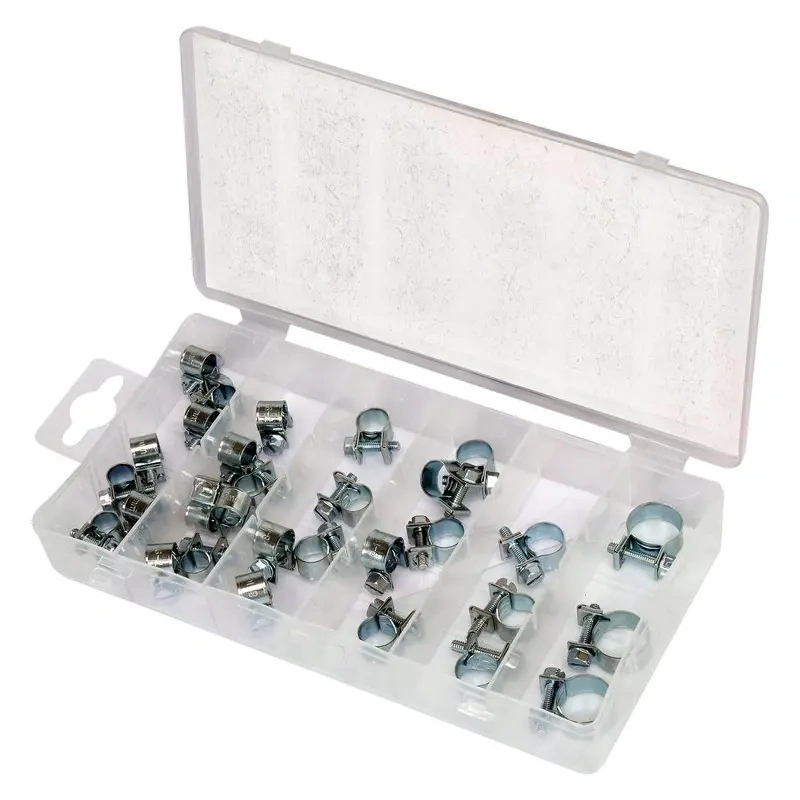 Kruvitud kaabliklambrite komplekt, mida soovitatakse kasutada auto- ja mehaaniliste teenuste jaoks. Pakitud praktilisse plastkarpi
